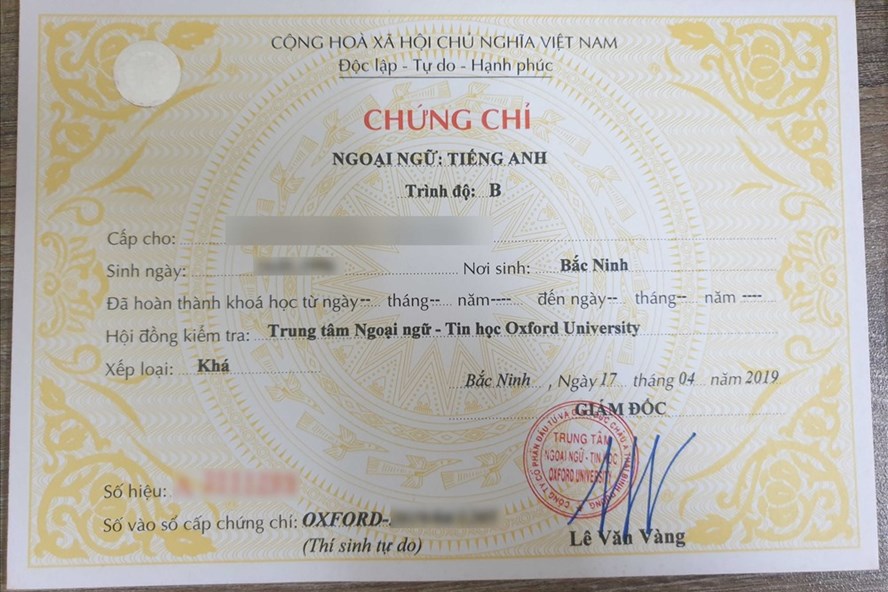 Chứng chỉ ngoại ngữ Trung tâm Oxford University cấp do ông Lê Văn Vàng ký.