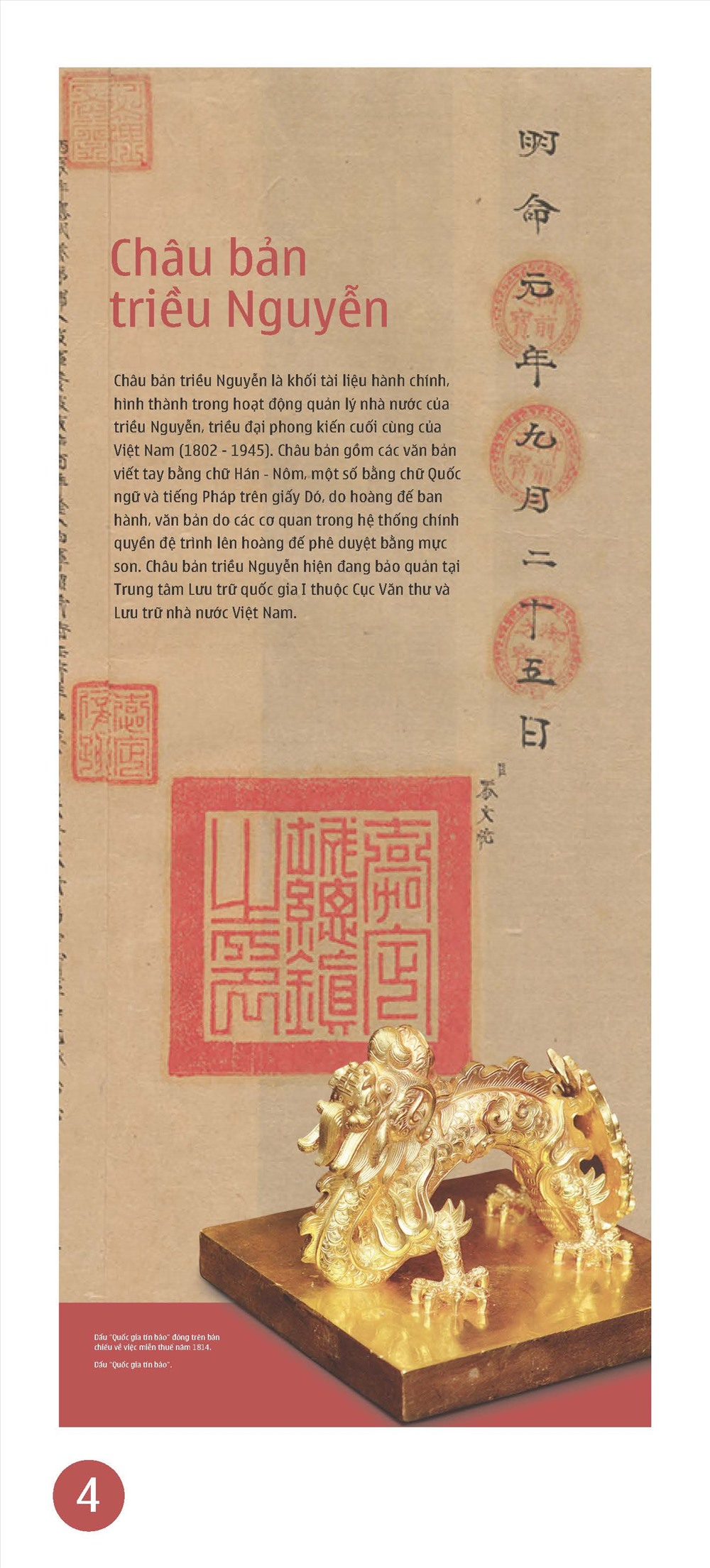 Triển lãm giới thiệu gần 50 tài liệu, hình ảnh được lựa chọn từ Di sản tư liệu thế giới Châu bản, Mộc bản triều Nguyễn và một số tài liệu lưu trữ tiêu biểu hiện bảo quản tại các Trung tâm Lưu trữ quốc gia Việt Nam.